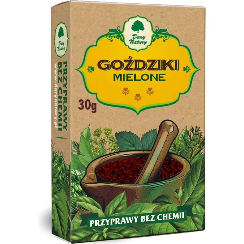 Goździki to aromatyczna przyprawa używana do mięs, dziczyzny, ryb i marynat. Nadają aromat także wyrobom cukierniczym, idealne do grzanego wina. masa netto: 30g składniki: goździki mielone 100%
