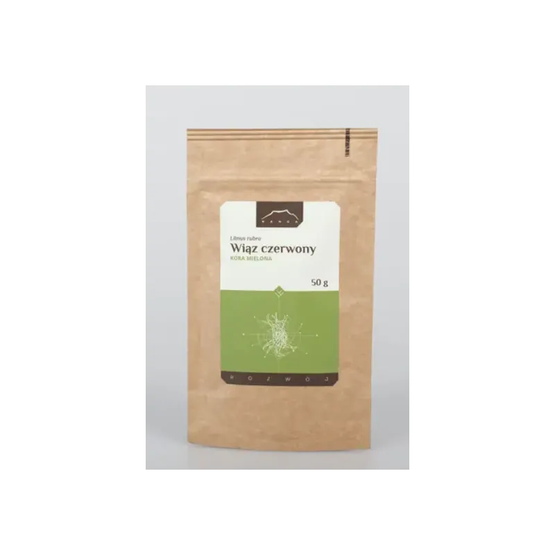 Wiąz czerwony (Ulmus rubra) – rozłożyste drzewo z rodziny wiązowatych, dorastające do 20 metrów wysokości, o owalnych ząbkowanych liściach, które jesienią zmieniają swoją barwę na intensywnie czerwoną. Naturalnie występuje na południowo-środkowych obszarach Ameryki Północnej. Surowcem zielarskim jest kora, która obfituje w takie substancje czynne, jak: śluzy, kwas salicylowy, czy flawonoidy. Dawniej stosowany był przez miejscową ludność u osób o obniżonej odporności, dla wzmocnienia układu pokarmowego, a także jako środek łagodzący podrażnienia skóry. Współcześnie kora wiązu czerwonego ceniona jest przede wszystkim za swoje kojące działanie na błony śluzowe układu trawiennego oraz oddechowego. Kwas salicylowy i flawonoidy wykazują działanie łagodzące podrażnienia, a obecne w korze śluzy tworzą specjalna warstwę, chroniącą błony śluzowe przed następnymi uszkodzeniami. Właściwości prozdrowotne: Działa łagodząco na błony śluzowe układu pokarmowego i oddechowego. Otacza błony śluzowe warstwą ochronną. Składniki: Wiąz czerwony (Ulmus rubra) – kora 100%. Surowiec najwyższej jakości! Wiąz czerwony dostępny w formie ciętej lub mielonej. Produkt najwyższej jakości! Kraj pochodzenia: USA. Zalecany sposób użycia: Kora wiązu w proszku: Pół łyżeczki proszku zalać połową szklanki ciepłej wody i wymieszać. Odstawić na 10-15 minut po czym wypić wyciąg bez osadu. Stosować 3 razy dziennie między posiłkami. Sposób przechowywania: Przechowywać w zamkniętym opakowaniu, w temperaturze pokojowej, w miejscu niedostępnym dla małych dzieci. Przeciwwskazania: Ciąża, karmienie piersią, nadwrażliwość na roślinę.