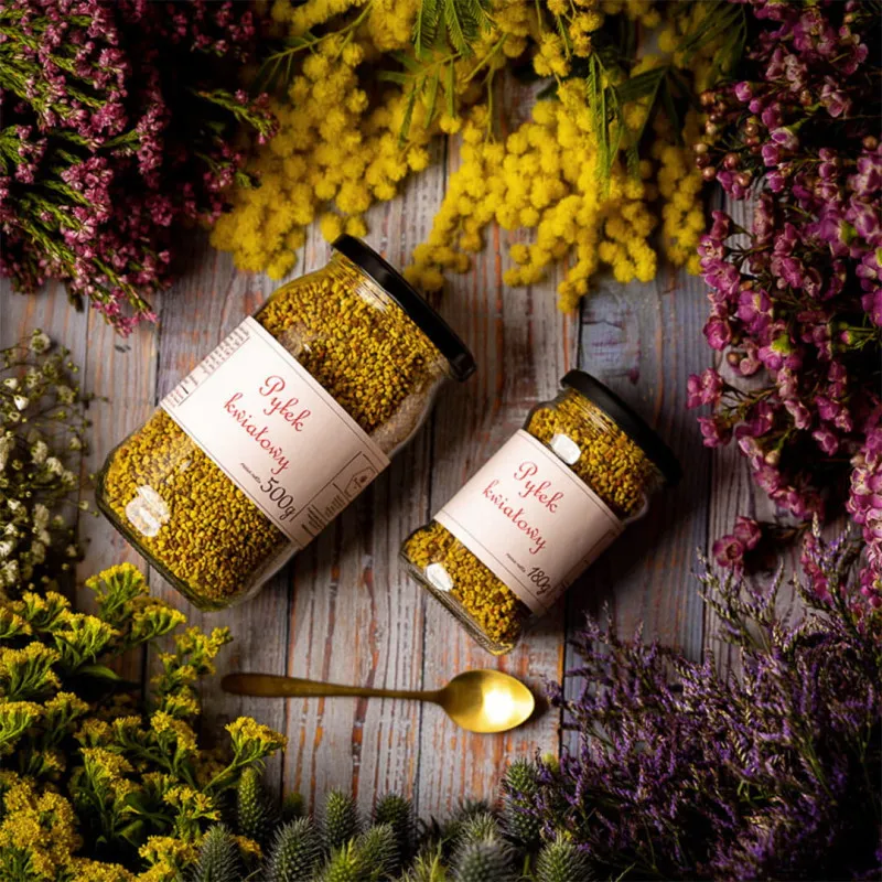 Z czystych i dzikich terenów, w sercu podkarpackiej natury, na urokliwym Pogórzu Dynowskim - skąd pochodzi nasz miód, pochodzi również nasz unikalny pyłek kwiatowy-pszczeli. Jego ulotna, delikatna formuła nie ułatwia zbiorów, ale warto się o niego postarać. Ten produkt z ula to bomba białkowo-witaminowa, pełna minerałów i mikroelementów, które fantastycznie regulują proces przemiany materii, dodają witalności, pomagają dbać o młodą i jędrną skórę, mocne włosy i kości. Pyłek ma zbawienne działanie na układ trawienny, a ze względu na właściwości detoksykacyjne, odmładza i pomaga zniwelować skutki stresu oksydacyjnego. Pyłek jest bogaty również w lipidy. Działa antybakteryjnie i przeciwgrzybiczo. To eliksir zdrowia i wiecznej młodości.