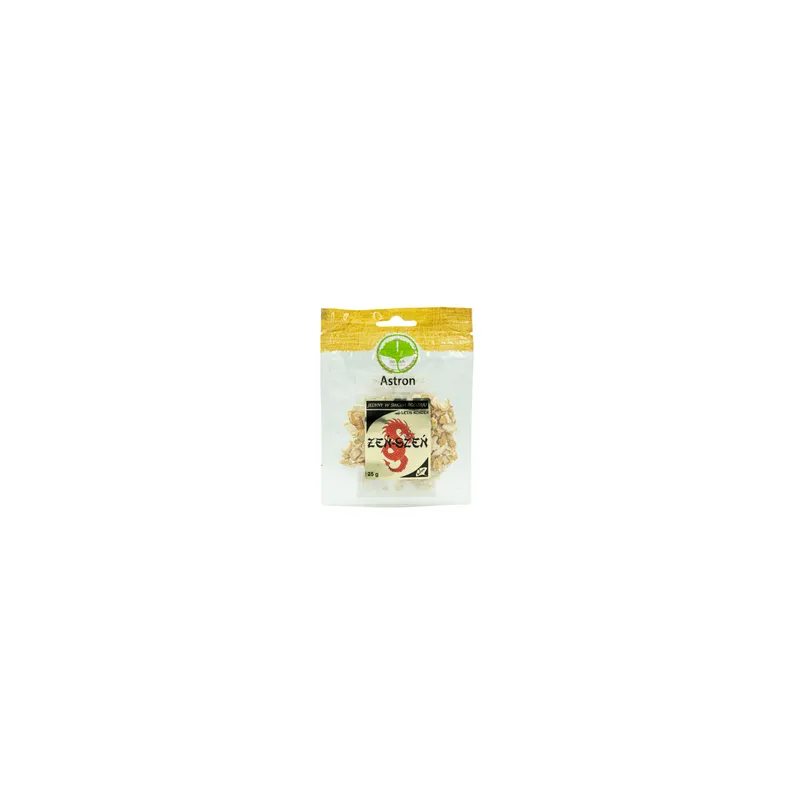 Żeń-szeń koreański (Panax ginseng) — cięty korzeń w opakowaniu 25 g od firmy Astron. Naturalny, starannie wysuszony i pocięty korzeń przeznaczony do przygotowywania naparów, maceratów lub jako dodatek do potraw. Produkt nie zawiera sztucznych dodatków ani wypełniaczy.