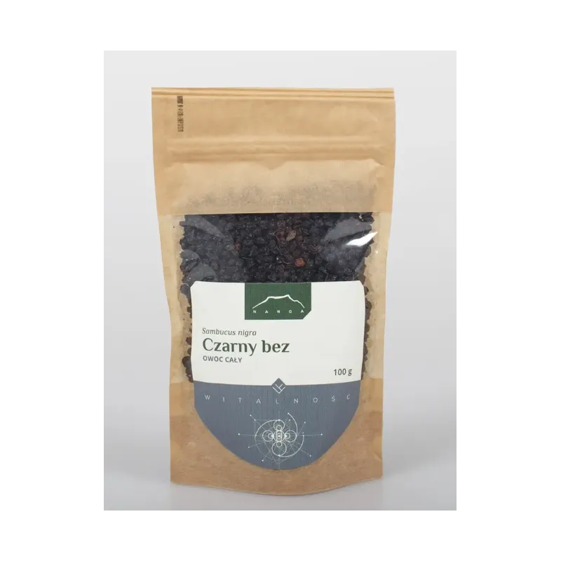 Owoc czarnego bzu (Sambucus nigra) w postaci suszonych owoców marki NANGA, opakowanie 100 g, to naturalny produkt roślinny ceniony w tradycyjnym ziołolecznictwie. Suszone owoce czarnego bzu charakteryzują się ciemną barwą oraz intensywnym aromatem i smakiem, dzięki czemu nadają się do przygotowywania naparów, herbat, nalewek oraz dodatków kulinarnych.