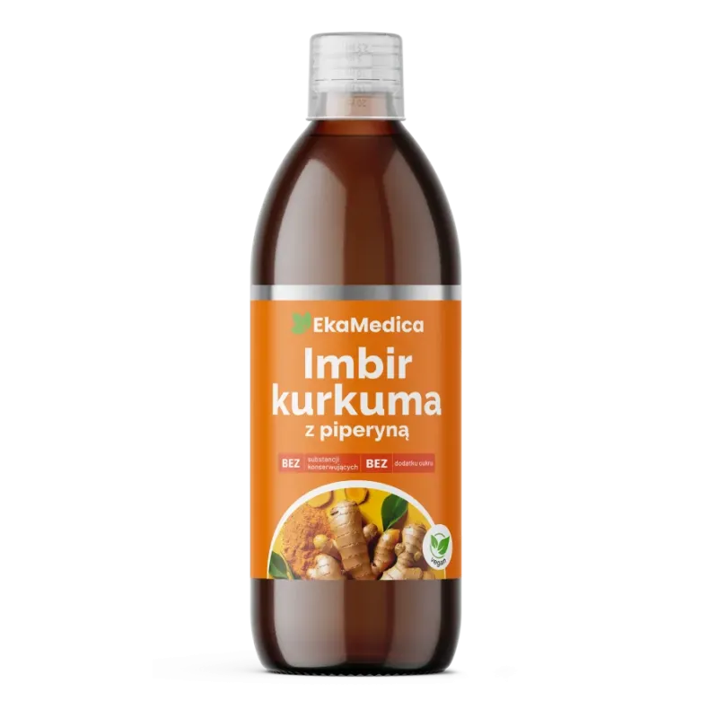 Imbir + Kurkuma z piperyną 500 ml EkaMedica to naturalny suplement diety wspierający odporność, zdrowie układu pokarmowego i stawów, idealny w codziennej diecie osób dbających o witalność i odporność organizmu.
