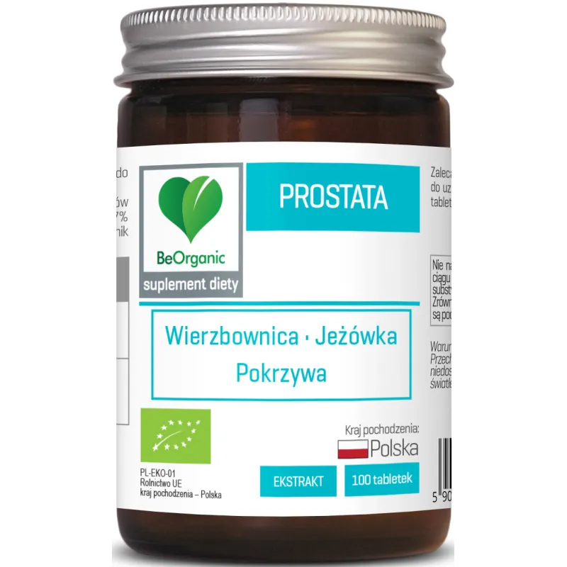 BeOrganic Prostata BIO 400 mg to ekologiczny suplement diety opracowany specjalnie dla mężczyzn, którzy chcą zadbać o prawidłowe funkcjonowanie prostaty i układu moczowego w naturalny sposób. Produkt zawiera wyłącznie składniki roślinne pochodzące z certyfikowanych upraw BIO oraz otrzymywane przy zastosowaniu ekologicznej, wodnej metody ekstrakcji, bez użycia chemicznych rozpuszczalników.