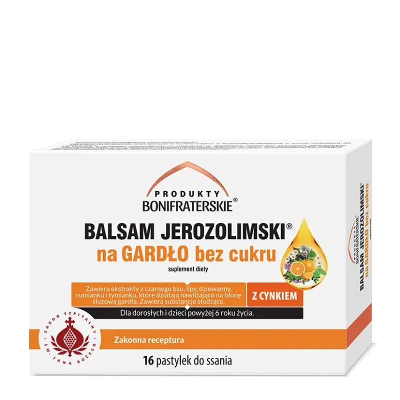 Balsam Jerozolimski® na gardło bez cukru to naturalny suplement diety, opracowany według zakonnej receptury Braci Bonifratrów. Produkt łączy starannie dobrane ekstrakty ziół z dodatkiem cynku, wspierając prawidłowe funkcjonowanie gardła, strun głosowych oraz układu odpornościowego. Pastylki o przyjemnym cytrusowym smaku zawierają naturalny aromat pomarańczy i są idealne dla dzieci powyżej 6 roku życia oraz dorosłych.