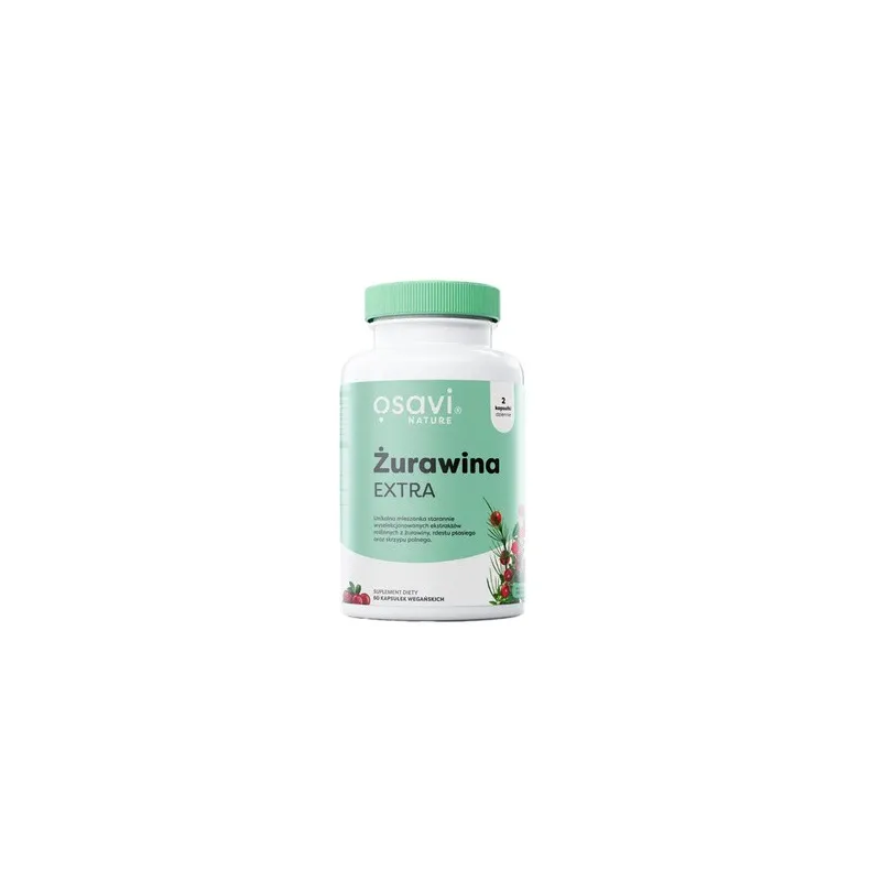 Żurawina Extra Osavi to suplement diety zawierający standaryzowany ekstrakt z żurawiny w kapsułkach wegańskich, bez glutenu, laktozy i GMO.