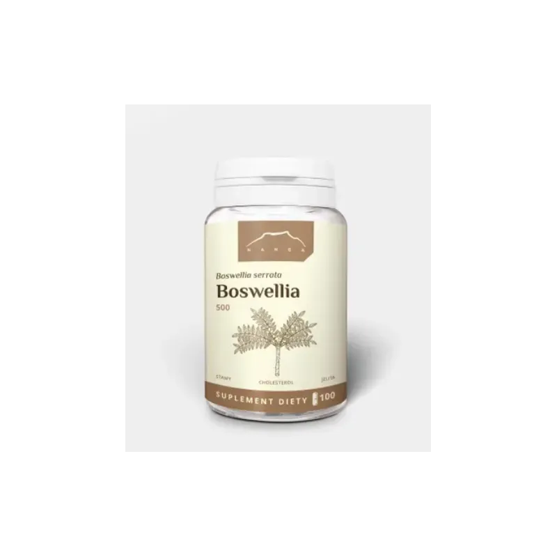 Kapsułki Boswellia 500 – suplement diety stanowiący ekstrakt z żywicy kadzidłowca indyjskiego (Boswellia serrata), zawierający około 60% kwasów bosweliowych. Żywica kadzidłowca indyjskiego to surowiec pozyskiwany z drzewa Boswellia serrata występującego w tropikalnych rejonach Indii. Żywica ta posiada liczne właściwości prozdrowotne. Jej najważniejszymi składnikami aktywnymi są kwasy bosweliowe oraz olejki eteryczne. Już setki lat temu na Dalekim Wschodzie boswellia wykorzystywana była jako kadzidło łagodzące nerwy i wyciszające umysł. Z czasem zyskała popularność również w medycynie ajurwedyjskiej. Boswellia 500 cieszy się największym uznaniem wśród osób pragnących utrzymać stawy w doskonałej kondycji. Włączenie kapsułek do diety sprzyja łagodzeniu problemów w obrębie stawów oraz wspiera ich prawidłową ruchomość. Ponadto suplement ten pozytywnie wpływa na układ sercowo-naczyniowy oraz jelita, a także stanowi solidne wsparcie dla układu immunologicznego. Właściwości prozdrowotne: Skutecznie wspiera prawidłową pracę stawów. Wspomaga prawidłową odpowiedź przeciwzapalną, zwłaszcza w obrębie stawów i jelit. Pomaga utrzymać korzystny poziom cholesterolu i trójglicerydów we krwi, co pozytywnie wpływa na układ sercowo-naczyniowy. Wzmacnia naturalną odporność. Skład: 1 kapsułka zawiera 500 mg ekstraktu z Boswellia serrata standaryzowanego na 60% kwasów bosweliowych, kapsułka celulozowa. Bez dodatków barwiących i wypełniaczy. Produkt najwyższej jakości! Zalecany sposób użycia: 1 kapsułka dwa lub trzy razy dziennie przed posiłkiem. Sposób przechowywania: Przechowywać w zamkniętym opakowaniu w temperaturze pokojowej, w miejscu niedostępnym dla małych dzieci. Przeciwwskazania: Nie należy stosować u osób uczulonych na którykolwiek ze składników produktu. Produkt nie zalecany dla dzieci, kobiet w ciąży oraz karmiących piersią. Środki ostrożności: Suplementy diety nie mogą być stosowane jako substytut zróżnicowanej diety oraz nie zastąpią zdrowego trybu życia.