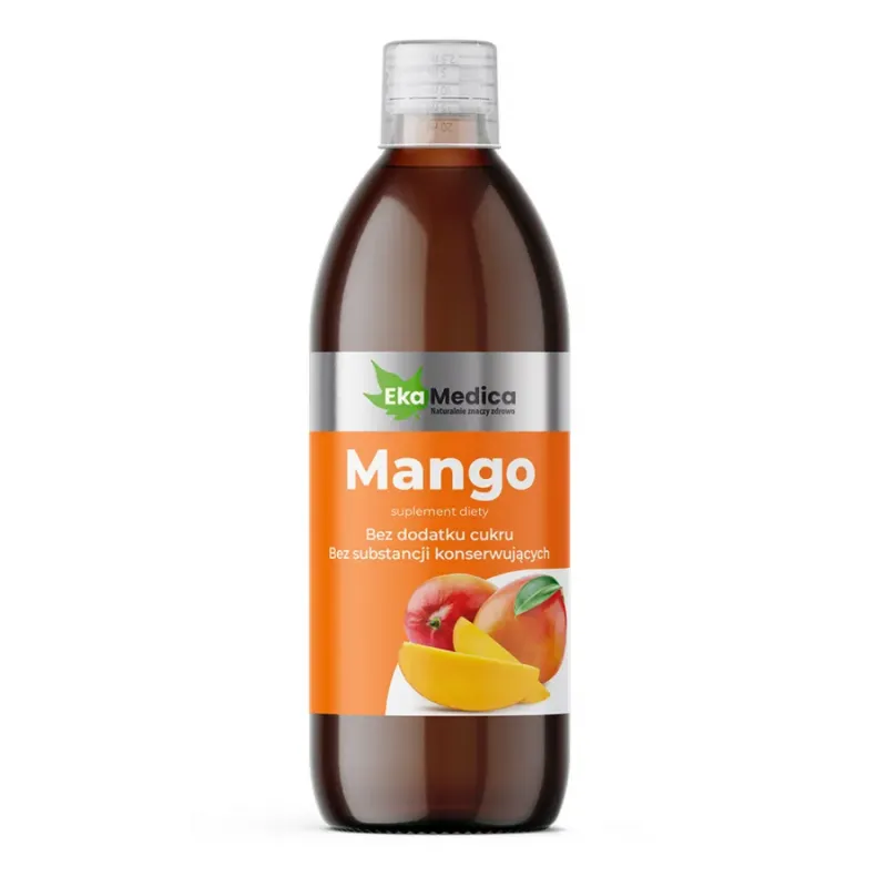 Mango 500 ml – EkaMedica Sok z mango w płynie, otrzymany z wysokiej jakości owoców i przeznaczony jako uzupełnienie codziennej diety. Produkt cechuje się naturalnym, słodkim smakiem charakterystycznym dla dojrzałego mango. Sok stanowi źródło składników pochodzenia naturalnego, w tym polifenoli i witamin występujących w owocach mango, opisanych w literaturze żywieniowej jako elementy wspierające zróżnicowaną dietę. Sposób użycia: Zalecana dzienna porcja zgodnie z informacją producenta na etykiecie. Wstrząsnąć przed użyciem. Składniki: Puree z owoców mango 68,6%, sok z owoców mango 31,1% – wyprodukowano z zagęszczonego soku, standaryzowany ekstrakt z owoców camu camu (Myrciaria dubia) 0,3%, w tym witamina C. Porcja dzienna 50 ml zawiera 150 mg ekstraktu z owoców camu camu, w tym 15 mg witaminy C (18% RWS*) oraz 34,3 ml puree z mango i 15,6 ml soku z mango. *RWS – referencyjna wartość spożycia dla przeciętnej osoby dorosłej (8400 kJ/2000 kcal). Pojemność: 500 ml Producent: EkaMedica Przechowywanie: Po otwarciu przechowywać w lodówce i spożyć w określonym przez producenta czasie. Przechowywać z dala od światła i w miejscu suchym.