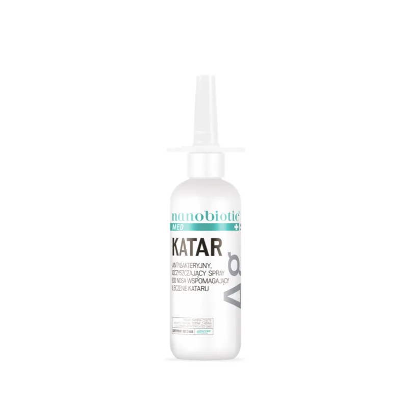 Sposób działania: Nanobiotic® Silver Katar, spray do nosa, pielęgnuje i chroni podczas infekcji bakteryjnych i grzybiczych nosa oraz zatok. Preparat wykazuje najwyższą skuteczność dzięki innowacyjnemu połączeniu działania srebra, złota i miedzi aXonnite®. Wielokierunkowo i szybko pomaga niweluje dyskomfort nosa i zatok w okresie przeziębień. Dzięki właściwościom srebra aXonnite® zapewnia oczyszczenie, ochronę i pielęgnację błon śluzowych. Hamuje namnażanie szkodliwych patogenów gromadzących się na błonach śluzowych. Złoto aXonnite® i pantenol regenerują, wzmacniają i nawilżają błony śluzowe, poprawiając ich ogólny stan. Srebro aXonnite®, ekstrakt z eukaliptusa oraz sól fizjologiczna udrażniają górne drogi oddechowe, wspomaga redukcję wydzielinę z nosa i ułatwiają oddychanie. Miedź aXonnite® niweluje zmiany o podłożu grzybiczym w obrębie nosa i zatok. Dodatkowa zawartość laktoferyny i ekstraktu z tymianku działa łagodząco i odkażająco. Stosowany profilaktycznie, skutecznie zapobiega nawrotom infekcji.