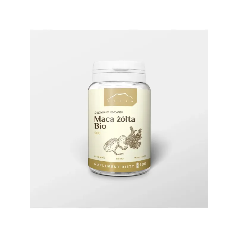 Maca żółta Bio marki Nanga to suplement diety w formie kapsułek, zawierający 500 mg organicznego proszku z korzenia maca (Lepidium meyenii) w jednej kapsułce. Maca jest tradycyjnie stosowana w celu wspierania naturalnej witalności, energii oraz równowagi organizmu, a jej żółta odmiana jest szczególnie ceniona w ziołolecznictwie.