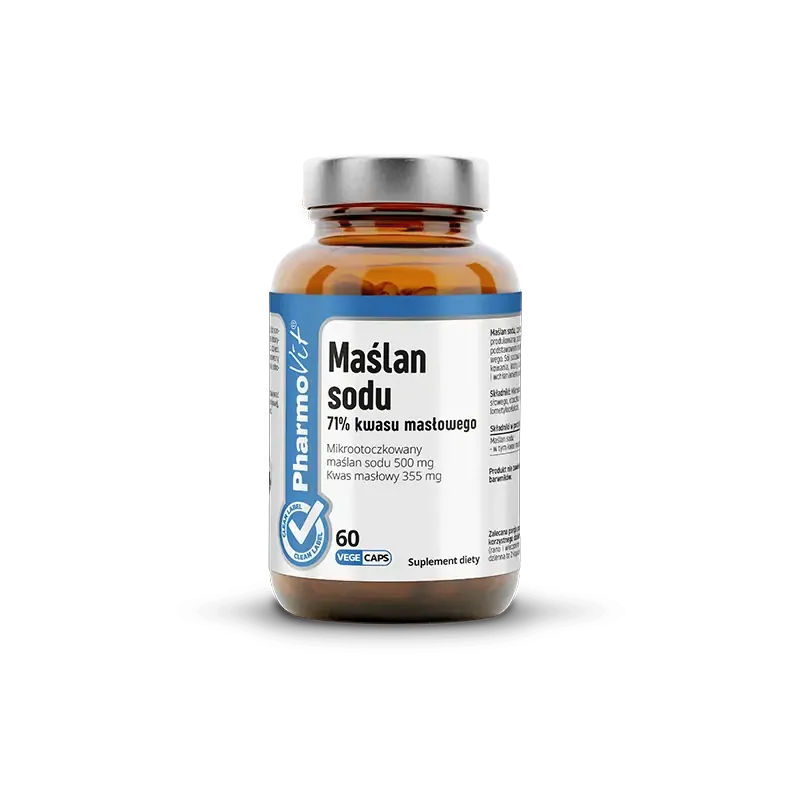 Maślan sodu marki Pharmovit to suplement diety zawierający 71% kwasu masłowego w formie łatwo przyswajalnych kapsułek. Kwas masłowy jest naturalnym kwasem tłuszczowym o działaniu wspierającym zdrowie jelit, funkcje trawienne oraz utrzymanie prawidłowej mikroflory jelitowej. Preparat może wspierać komfort przewodu pokarmowego i prawidłowe funkcjonowanie układu trawiennego.