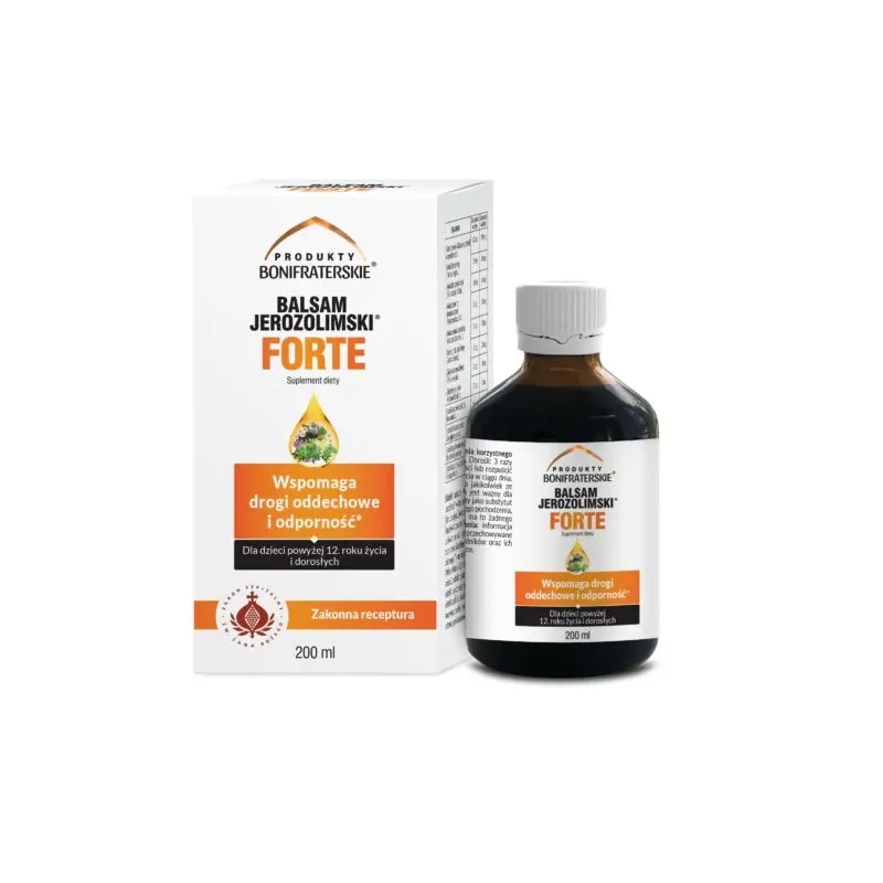 Balsam Jerozolimski Forte marki Produkty Bonifraterskie, pojemność 200 ml, to naturalny preparat pielęgnacyjny o wyjątkowej formule, opracowanej w oparciu o tradycyjne receptury zakonów bonifratrów. Balsam łagodzi podrażnienia, nawilża i regeneruje skórę, wspomagając jej ochronę i komfort na co dzień.